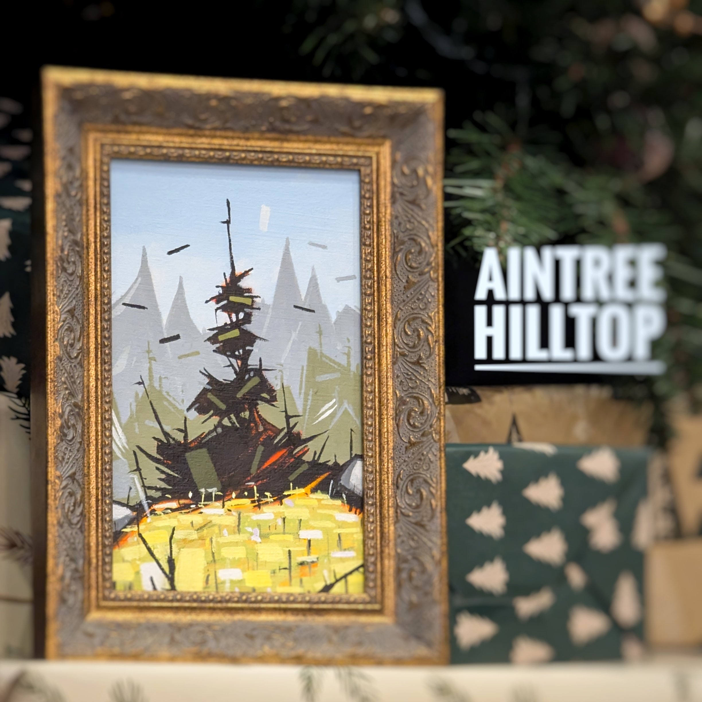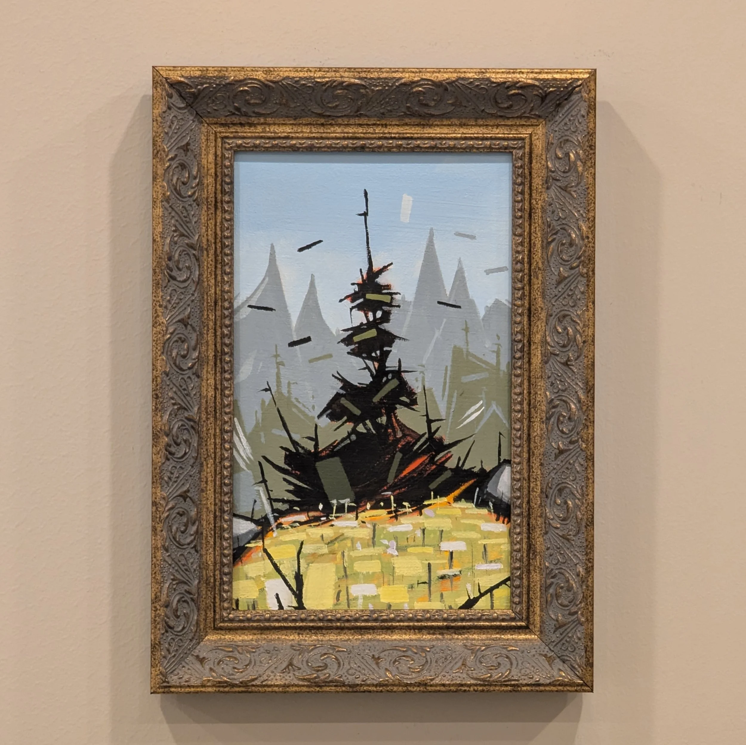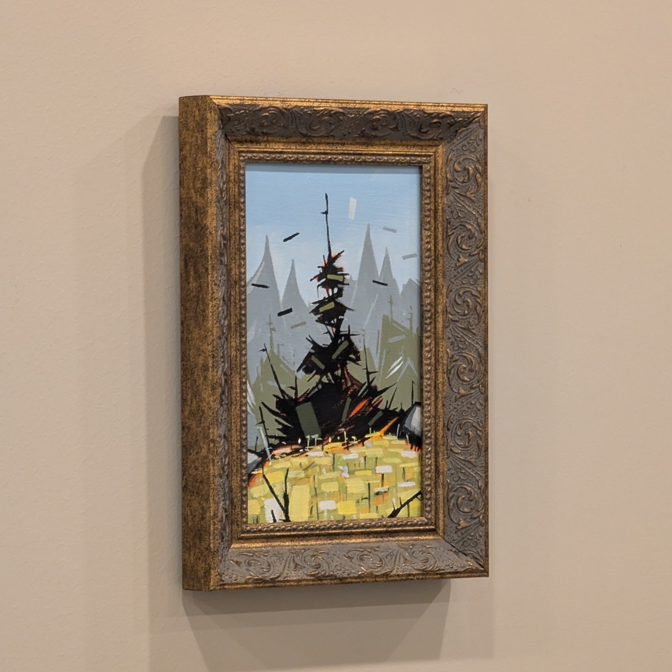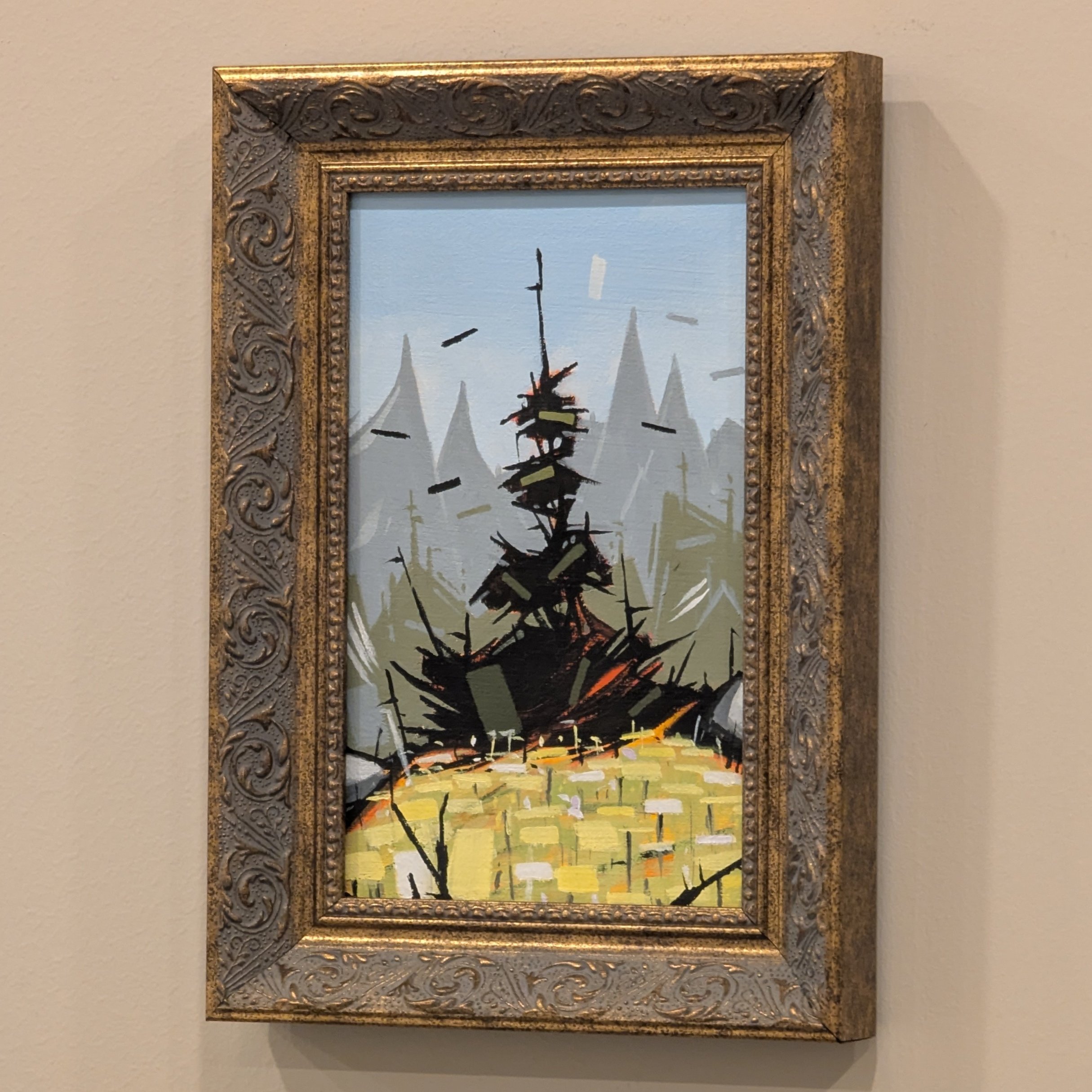 A beautiful and original 8x5” acrylic painting of a lone tree on a grassy hilltop. Comes in a splashy frame, ready to hang.