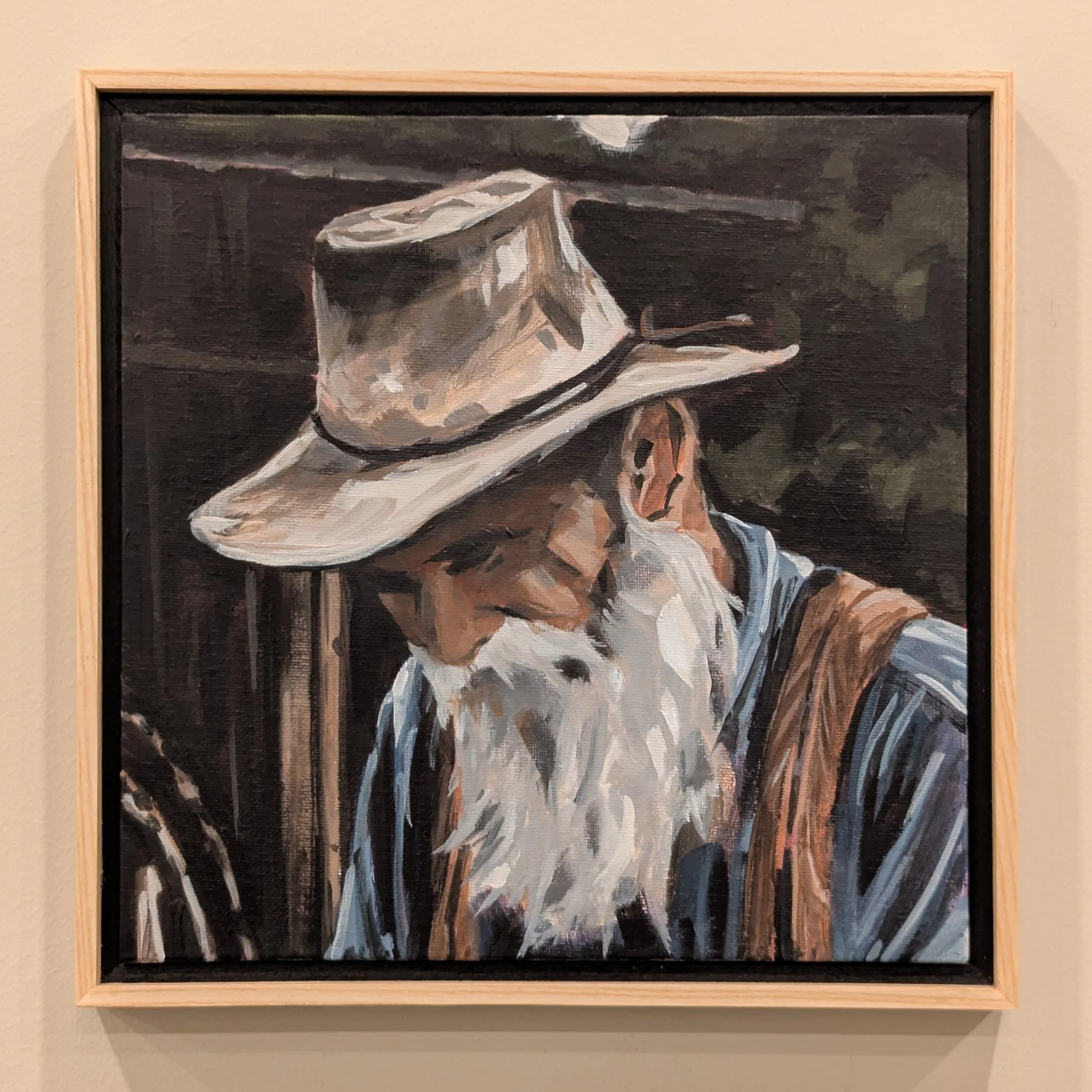 HEAVY is an original acrylic portrait capturing the quiet weight of years worn into a man’s life. An old cowboy sits before a weathered shed, working slowly at a wooden wheel — his long white beard and tired expression telling a story far deeper than the moment itself.