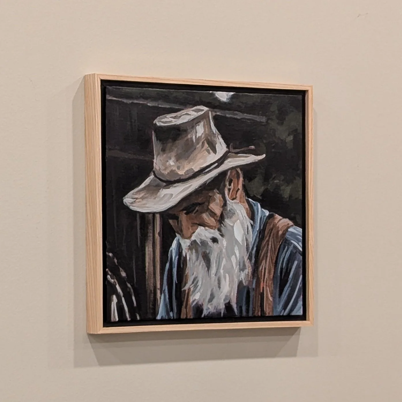 The painting comes framed in one of my handmade wood floater frames and arrives ready to hang. It’s a bold, reflective piece that adds depth and character to any space, especially for those drawn to western themes or stories of lived experience.